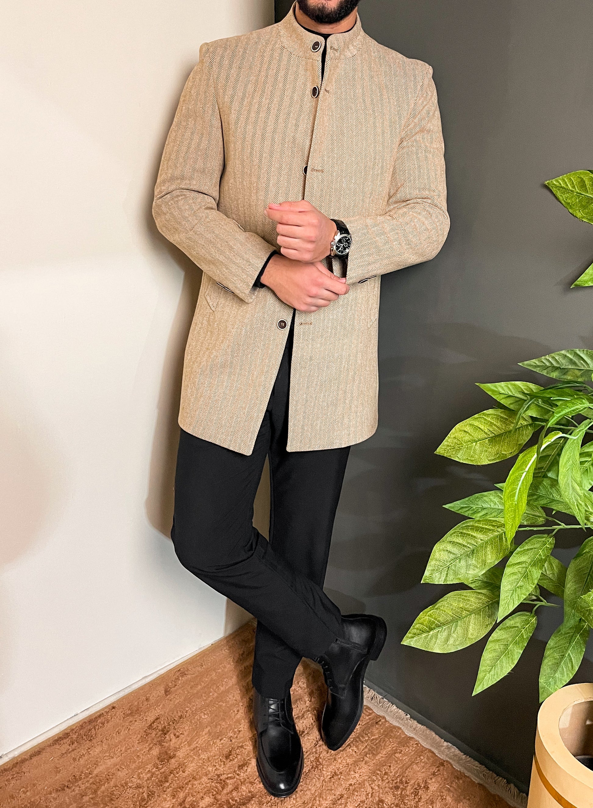 معطف أنيق من التويد باللون البيج يجمع بين الدفء والأناقة لإطلالة شتوية كلاسيكية وراقية.