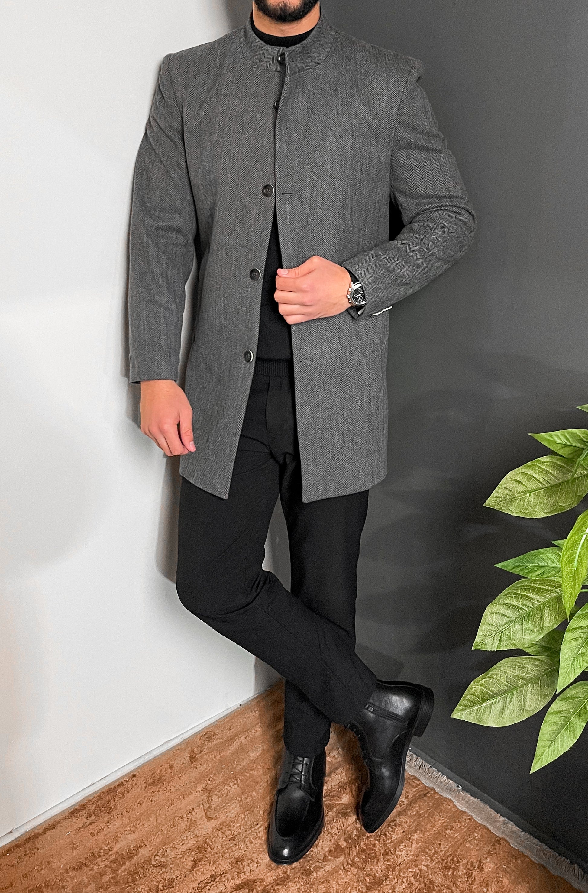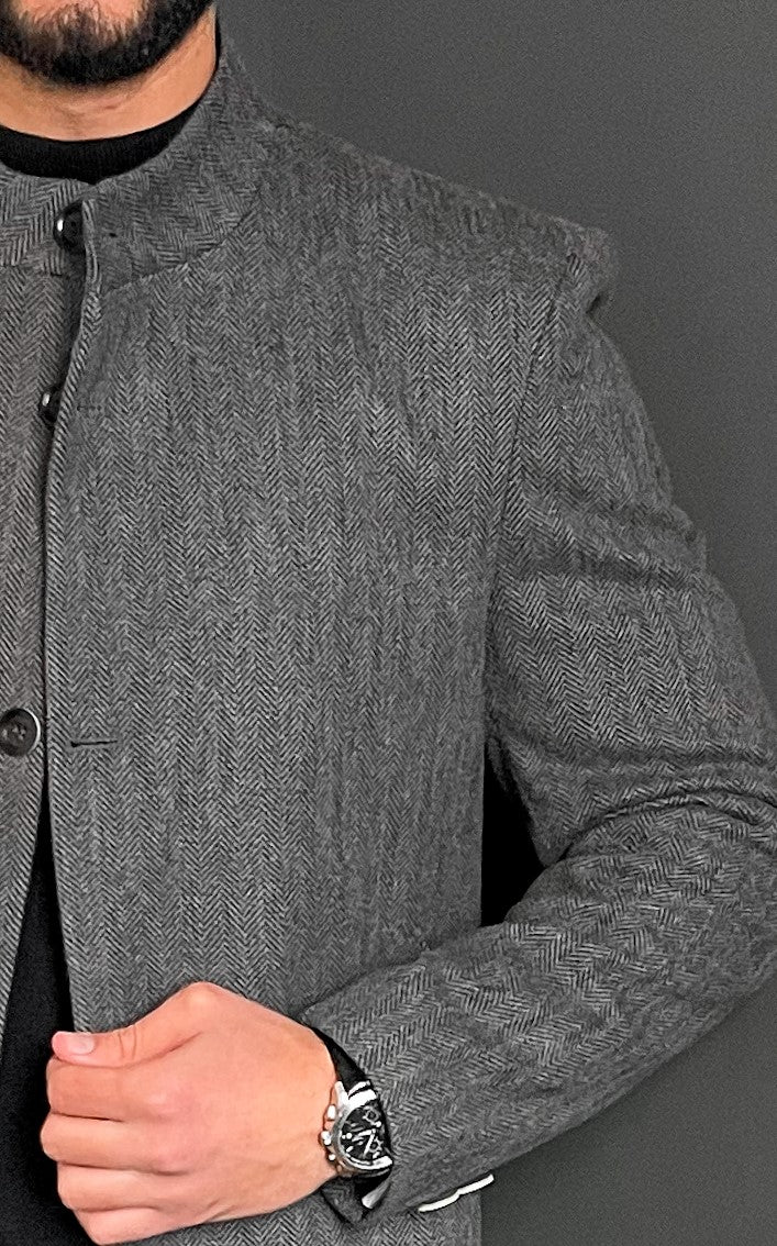 معطف أنيق من التويد الرمادي يجمع بين الدفء والأناقة لإطلالة شتوية كلاسيكية وأنيقة.