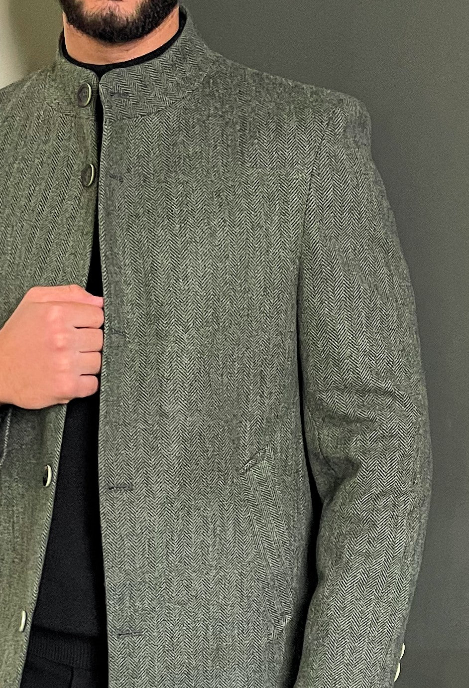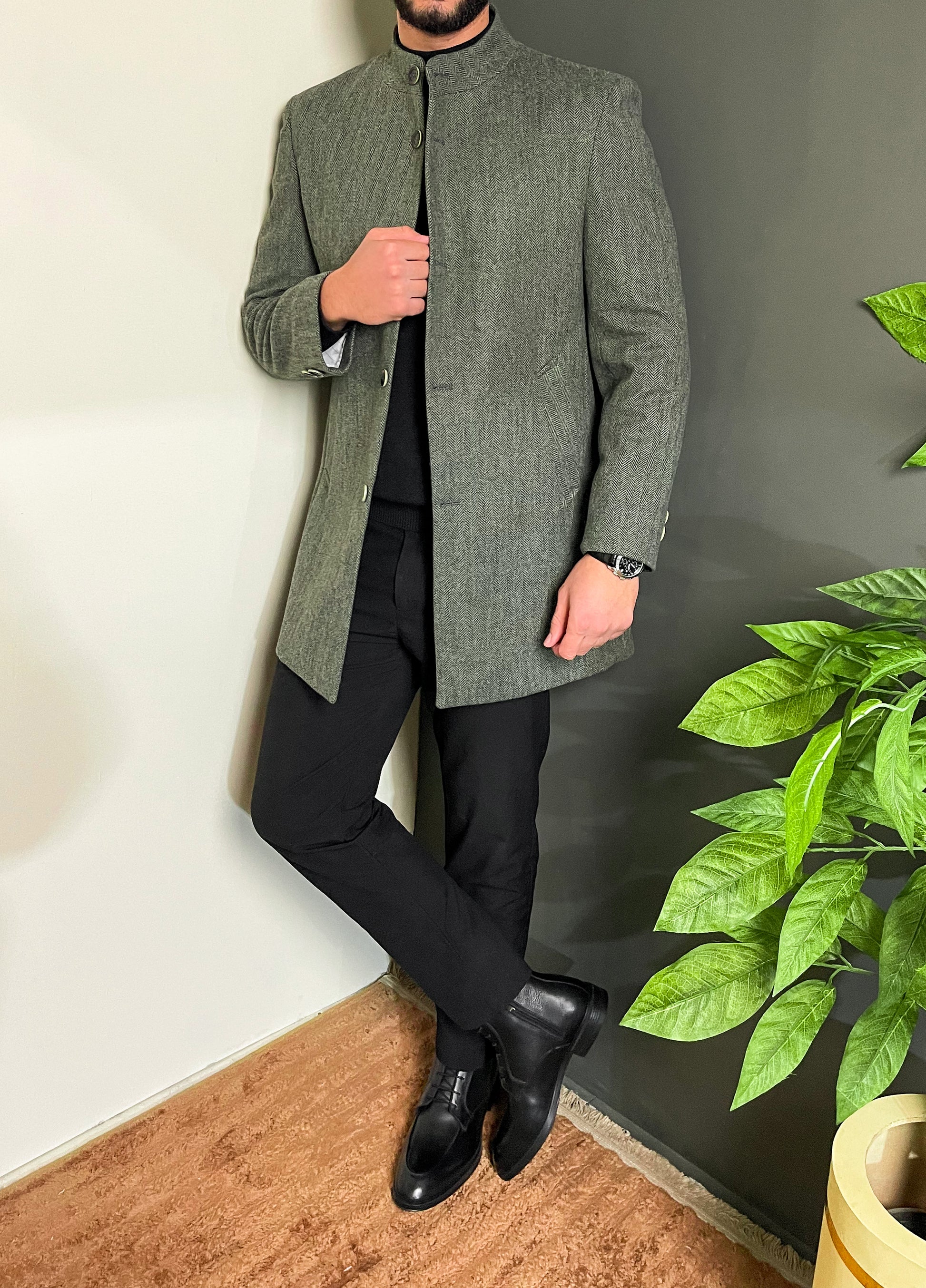 معطف أنيق من التويد بلون زيتوني يجمع بين الدفء والأناقة لإطلالة شتوية كلاسيكية وعصرية.